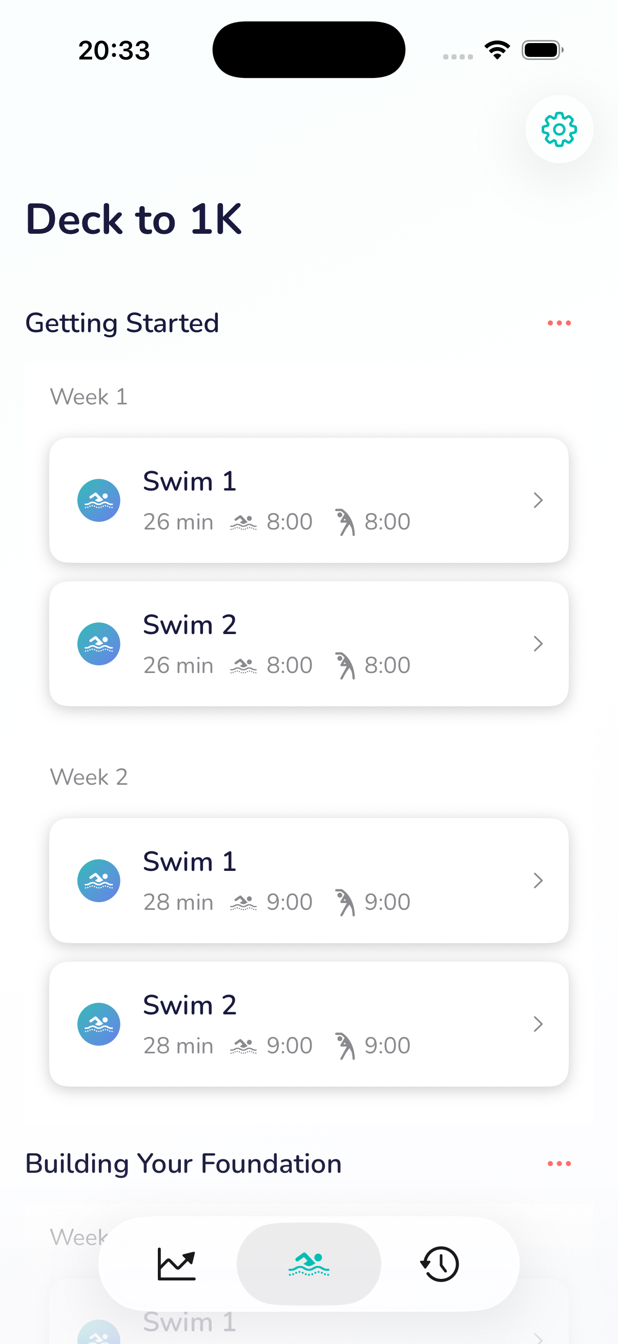 The full 12-week Deck to 1K program laid out week by week. Users can see their entire training arc at a glance and tap into any session.
