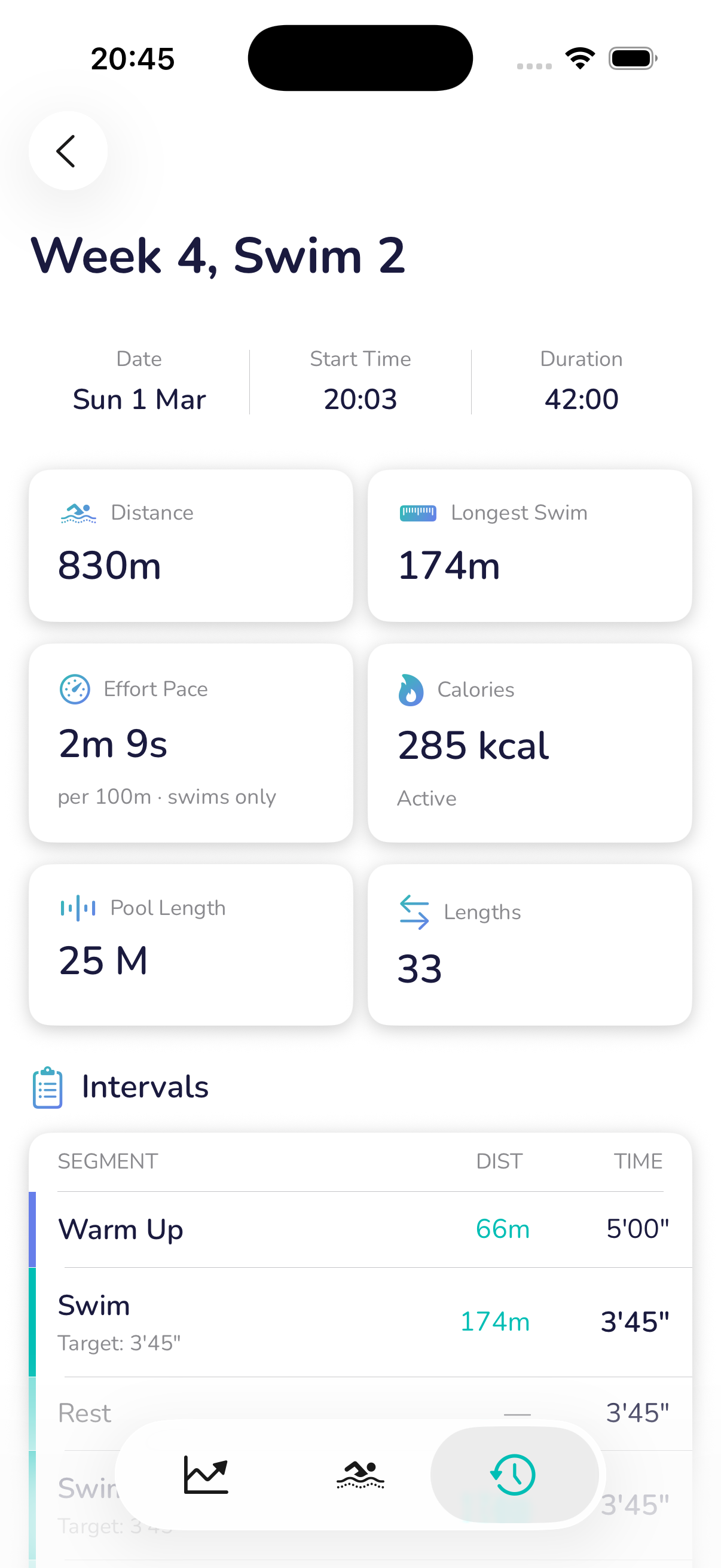 A detailed breakdown of a single completed workout — intervals, rest periods, total distance, and duration.